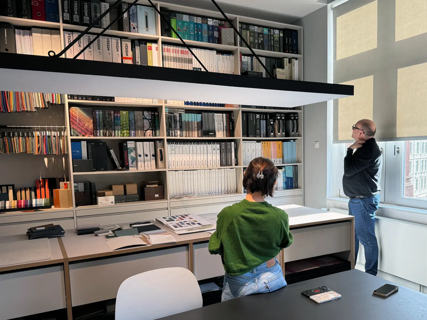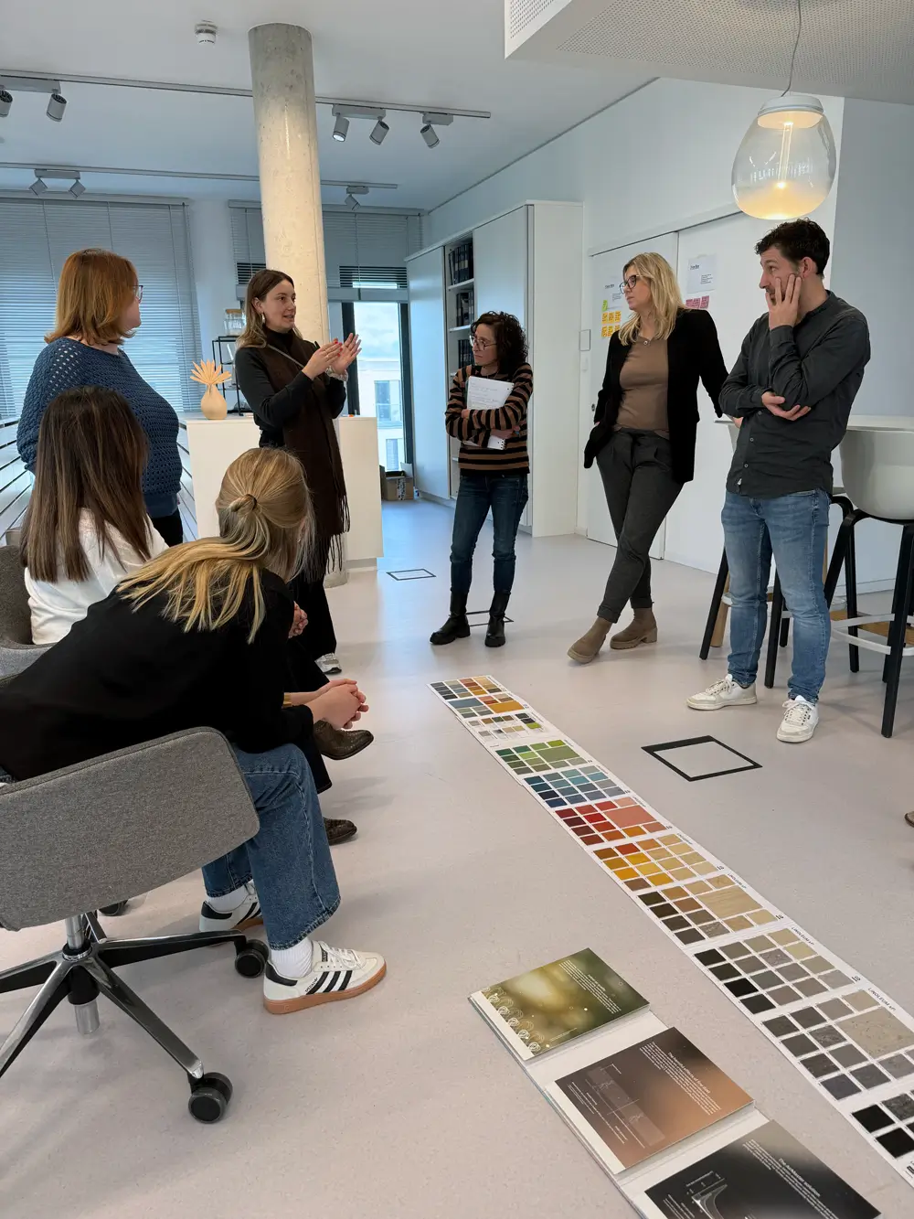 Zu Beginn stand die inhaltliche Einarbeitung: Wir sichteten die bestehende Musterbox und analysierten die bisherigen Überlegungen. An diesem Punkt kam auch unser Architekturbeirat Malte Just ins Spiel. In einer kompakten, zweistündigen Session haben wir gemeinsam mit ihm und Denise Fuhr, Innenarchitektin und verantwortlich für die Materialbibliothek bei Just Architekten, ausgewählte Muster unter die Lupe genommen und wertvolles Feedback gesammelt. Darauf aufbauend wurde das praxisnahe Workshopformat entwickelt.