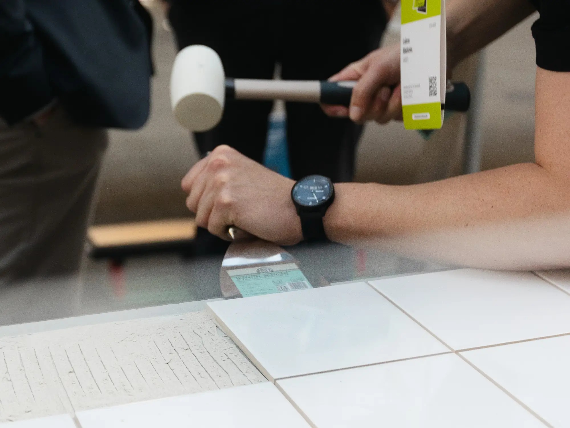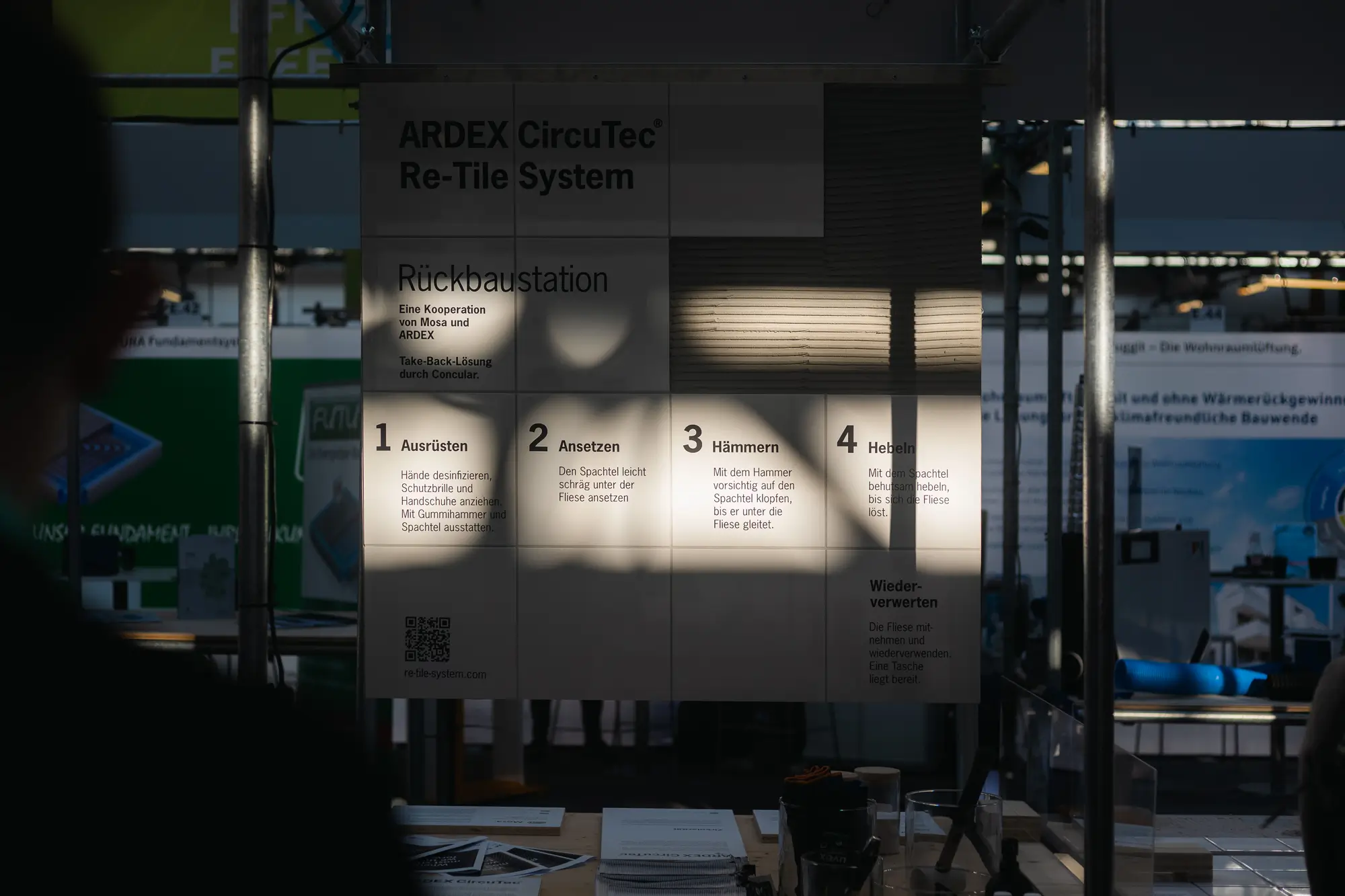 A key content highlight was the idea of viewing the stand not as a display area, but as an experience space. In other words: bringing the construction site to the trade fair. Together with Ardex, we added a practical de-installation station where visitors could take action themselves. Picking up a hammer and scraper, removing a tile, and experiencing circular installation first-hand rather than just reading about it.